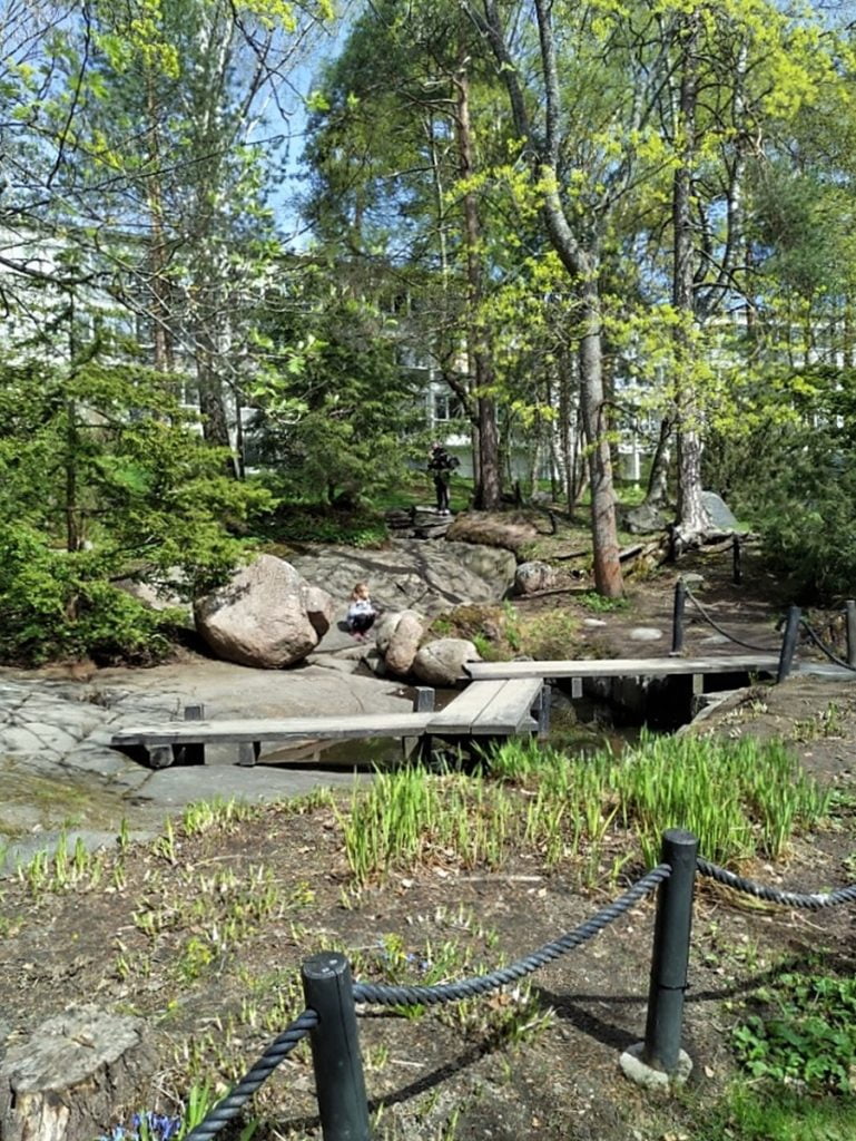 Jonkin aikaa puistossa pyörittyämme oli aika nauttia eväät, tällä kertaa ihan penkillä istuen sään takia. Sitten jatkoimme kulkureittiä pitkin talojen ja vesitornin välistä kohti japanilaista puistoa.