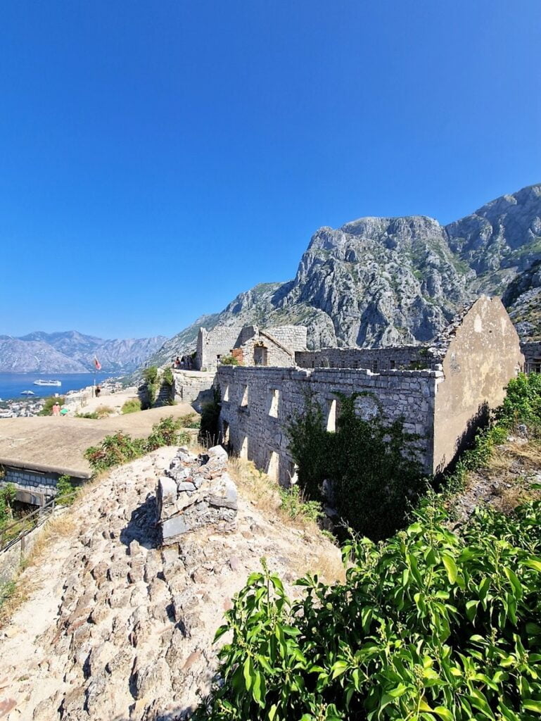 Unescon maailmanperintökohteisiin kuuluvaa Pyhän Johanneksen linnoitusta, (Sveti Ivan) on rakennettu pitkään 500-luvulta alkaen, joten sitä ovat olleet rakentamassa monet kansallisuudet riippuen Montenegron historian kulusta. Askelmia huipulle 280 metrin korkeuteen tulee noin 1350. Minulle nousu oli vaativaa, koska askelmat eivät sopineet lyhytkinttuisille ja yksinkertaisesti siksi, että olen niin huonokuntoinen. Mies olisi pystynyt menemään kovempaa vauhtia.