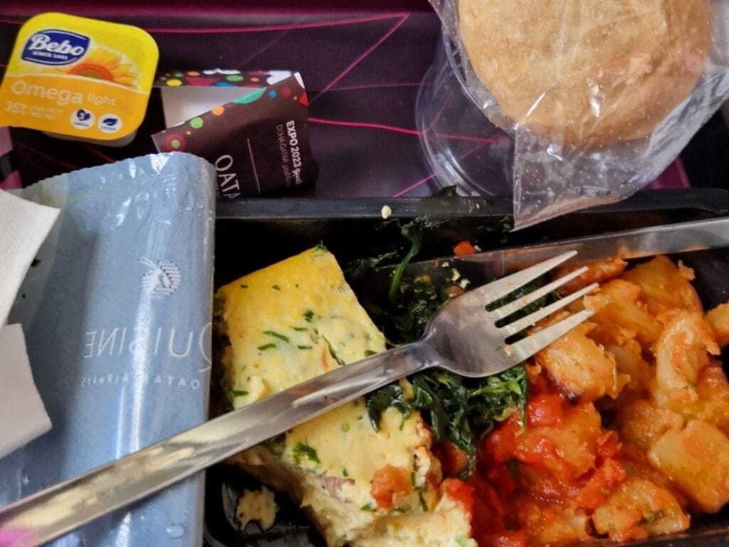 Ruoka oli huonointa ikinä. Olin valinnut gluteenittoman aterian, josta gluteenin lisäksi puuttui suola. Mukana oli sämpylä jota en syönyt sekä 35% rasvaa sisältävä levite. Kone oli myöhässä lähtiessään Helsingistä noin 25 min mutta laskeutui silti miltei määräajassa Dohaan.